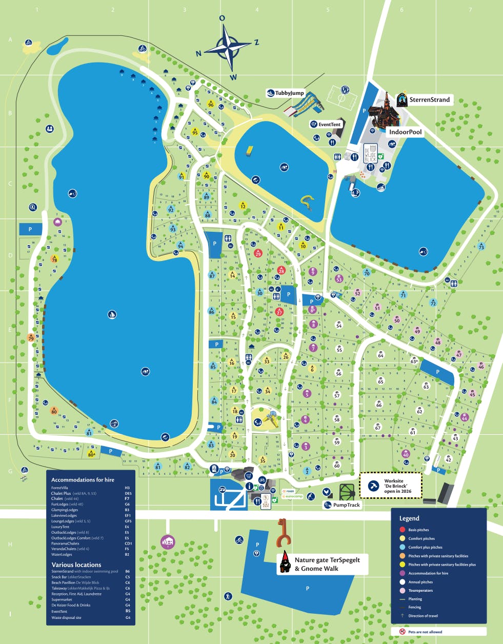 Het kampeerterrein van deze grote camping is ingedeeld in gezellige, kleinschalige kampeervelden met ruime beschutte en zonnige plaatsen. Van luxe kampeerplaatsen aan het water voorzien van privésanitair tot speciale kinderveldjes met speeltoestel voor gezinnen met kinderen t/m 6 jaar. Het recreatiepark heeft veel mogelijkheden voor huuraccommodaties. Er zijn verschillende soorten bijzondere lodges, safaritenten, chalets en mobilhomes. Wie zin heeft in een bijzondere vakantie huurt een FunLodge of gaat kamperen op het water in de luxe WaterLodges.Veel te doen en te beleven